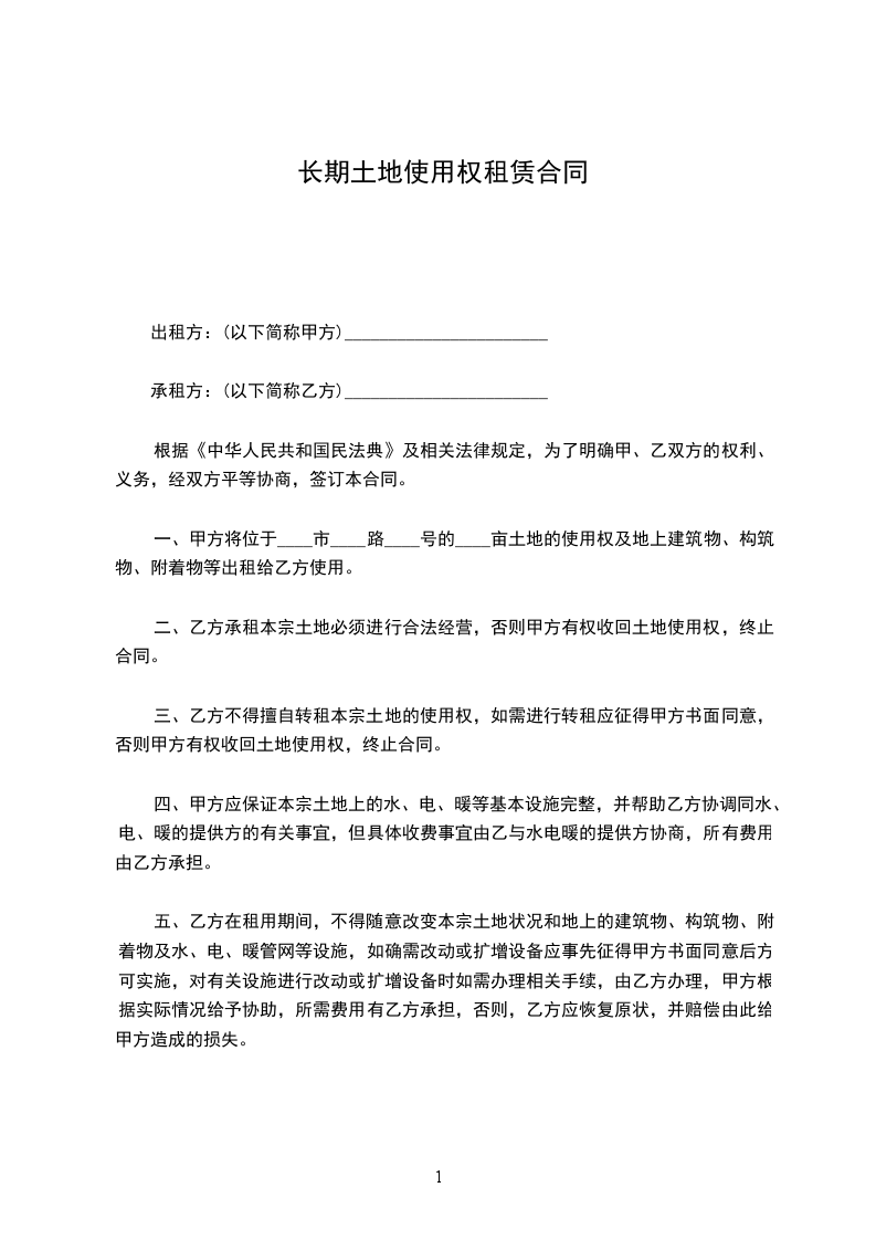 一、甲方将位于____市____路____号的____亩土地的使用权及地上建筑物、构筑物、附着物等出租给乙方使用。
