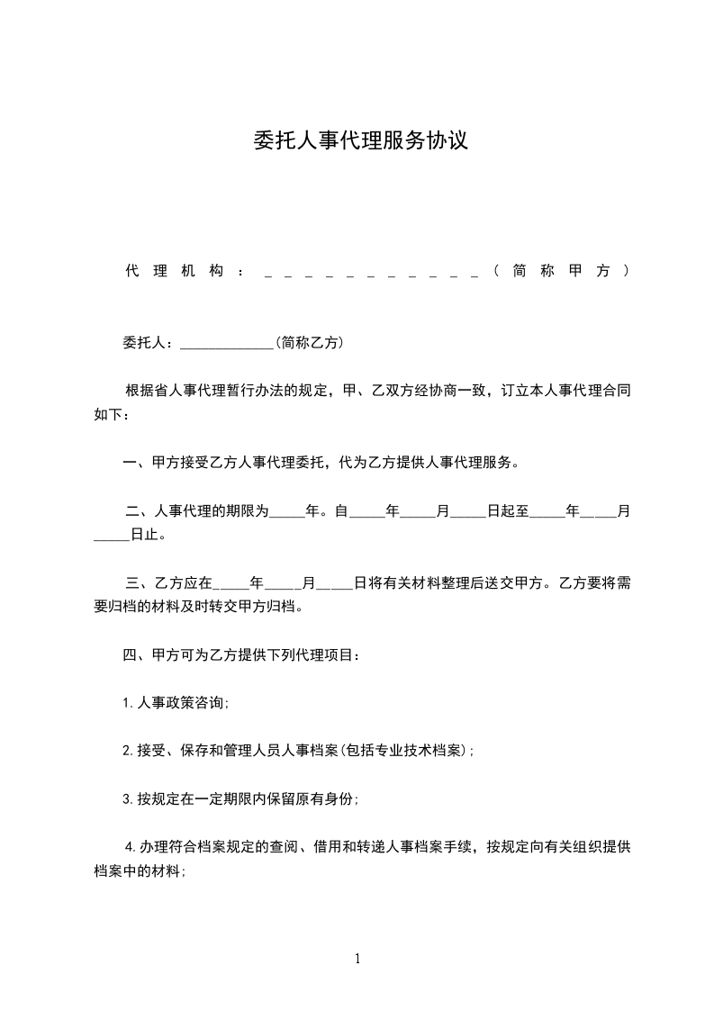 一、甲方接受乙方人事代理委托,为乙方提供人事代理服务;