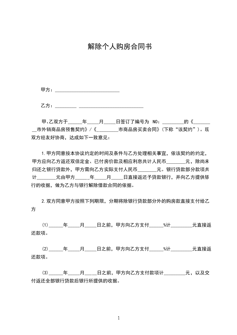 1.甲方同意按本协议约定的时间及条件与乙方处理相关事宜,依该契约的约定,甲方应向乙方返还双倍定金、已付房价款及相应利息共计人民币________元,除尚未归还之银行贷款外,甲方需向乙方实际支付人民币________元。银行贷款部分款项共计________元由甲方______年_____月_____日直接返还予贷款银行,并向乙方提供银行的收据,做为乙方与银行解除借款合同的依据。