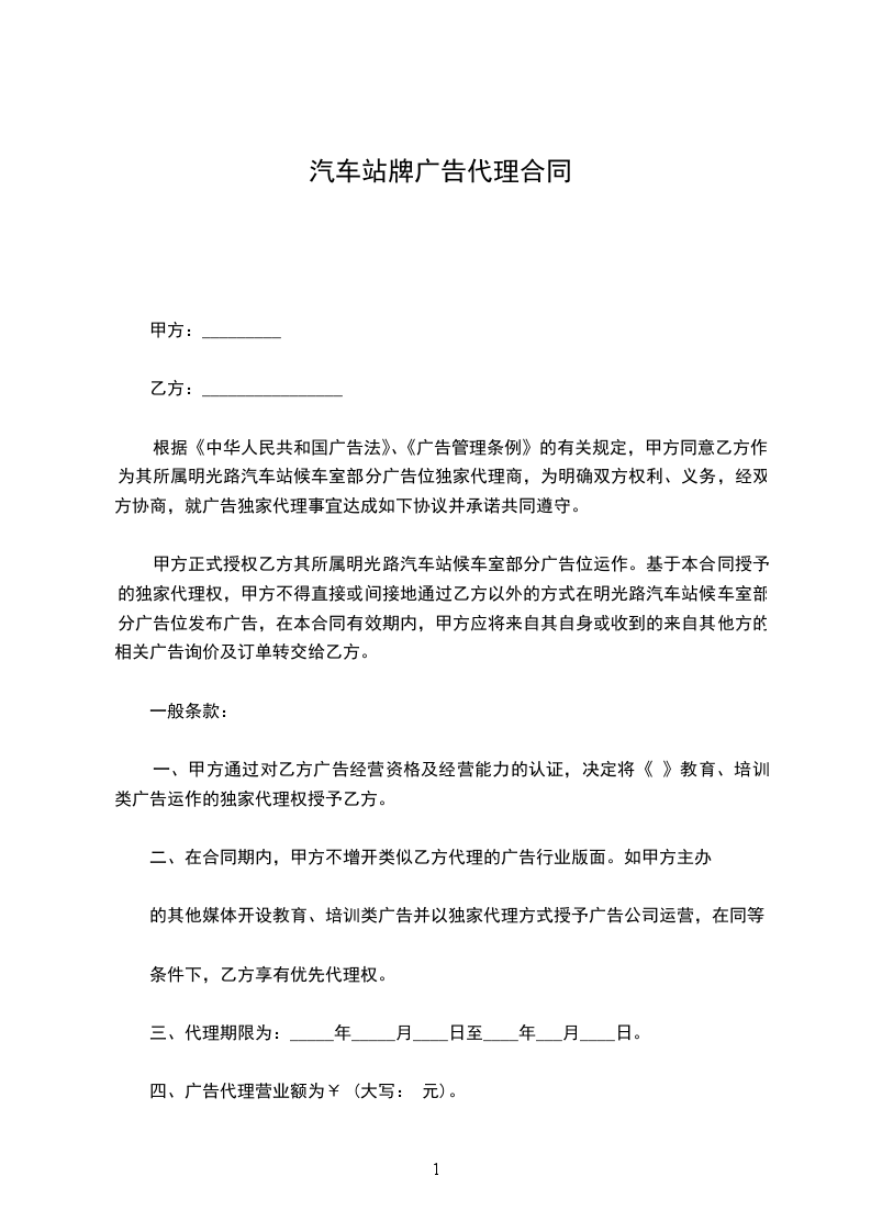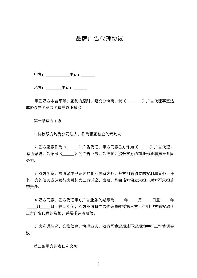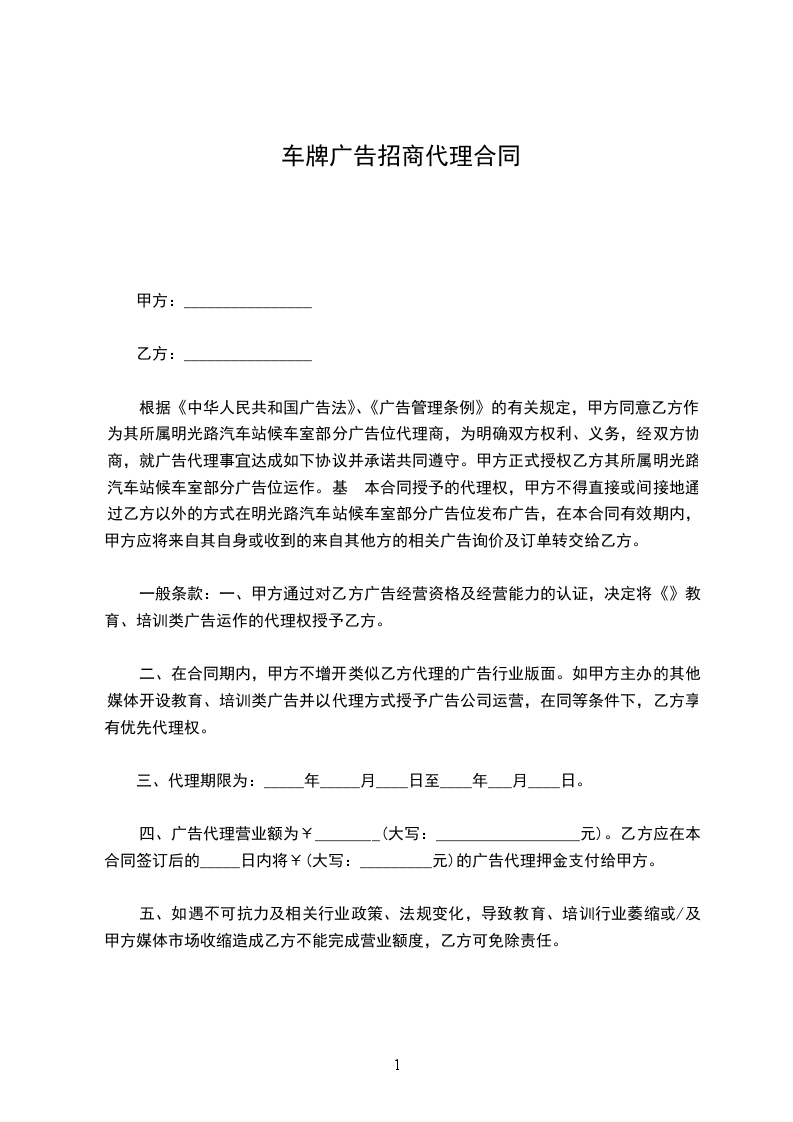 甲方委托乙方作为______________________________的广告招商代理(非唯一代理),招商区域不限,代理权由本合同和甲方书面形式授予,代理期限从________年________月________日起至________年________月________日止。