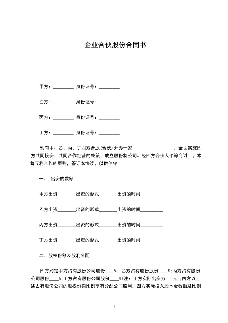 现有甲、乙、丙、丁四方合股(合伙)开办一家__________________,全面实施四方共同投资、共同合作经营的决策,成立股份制公司。经四方合伙人平等商讨 ,本着互利合作的原则,签订本协议,以供信守。