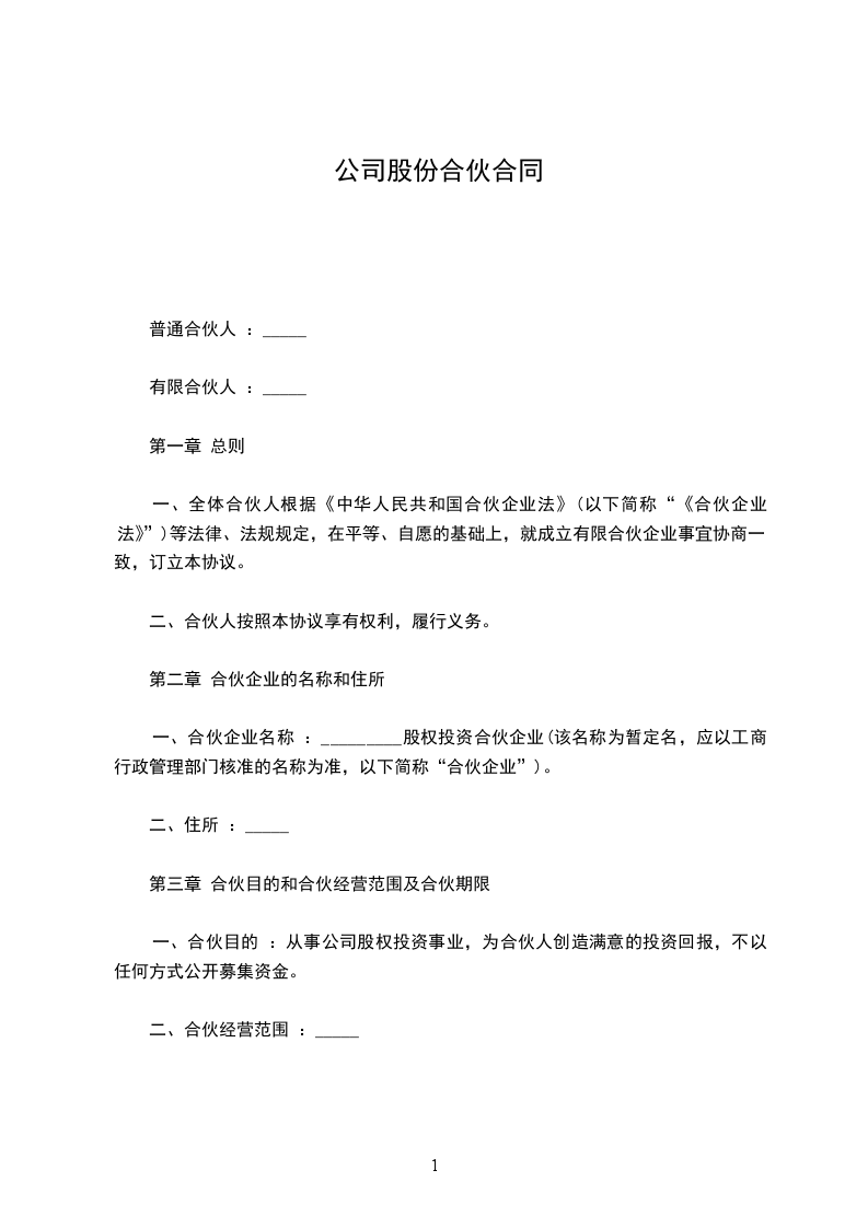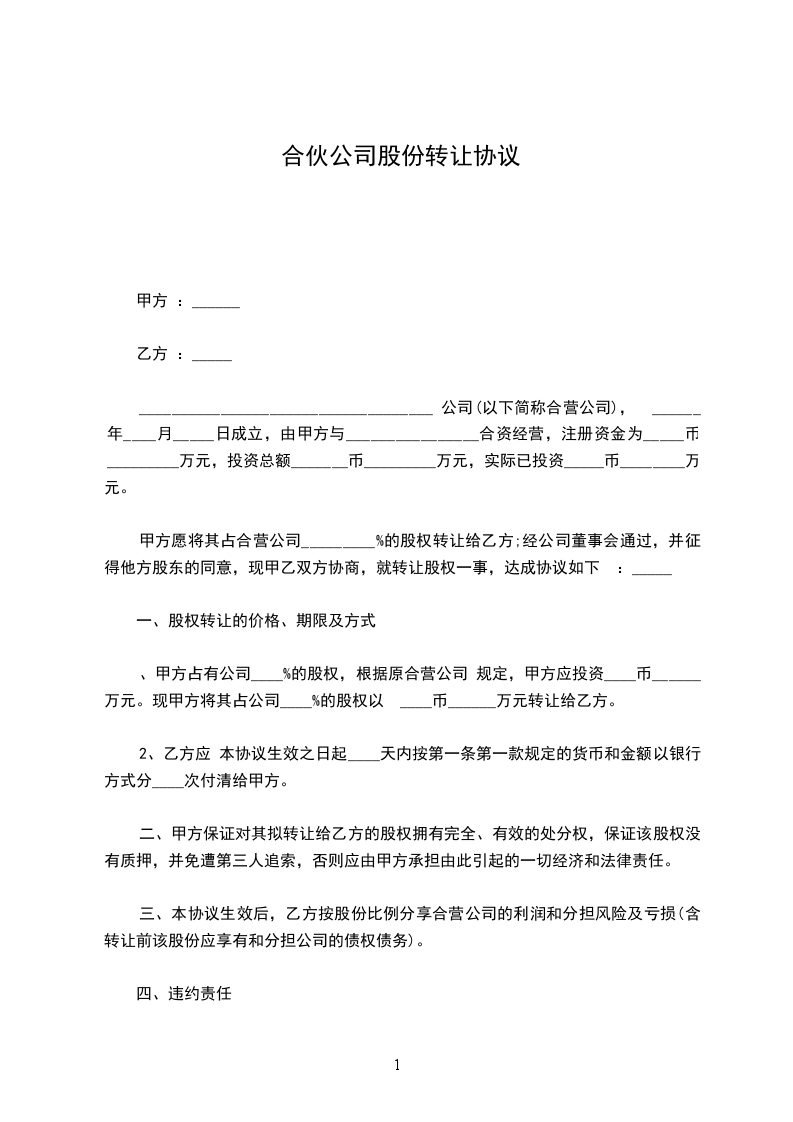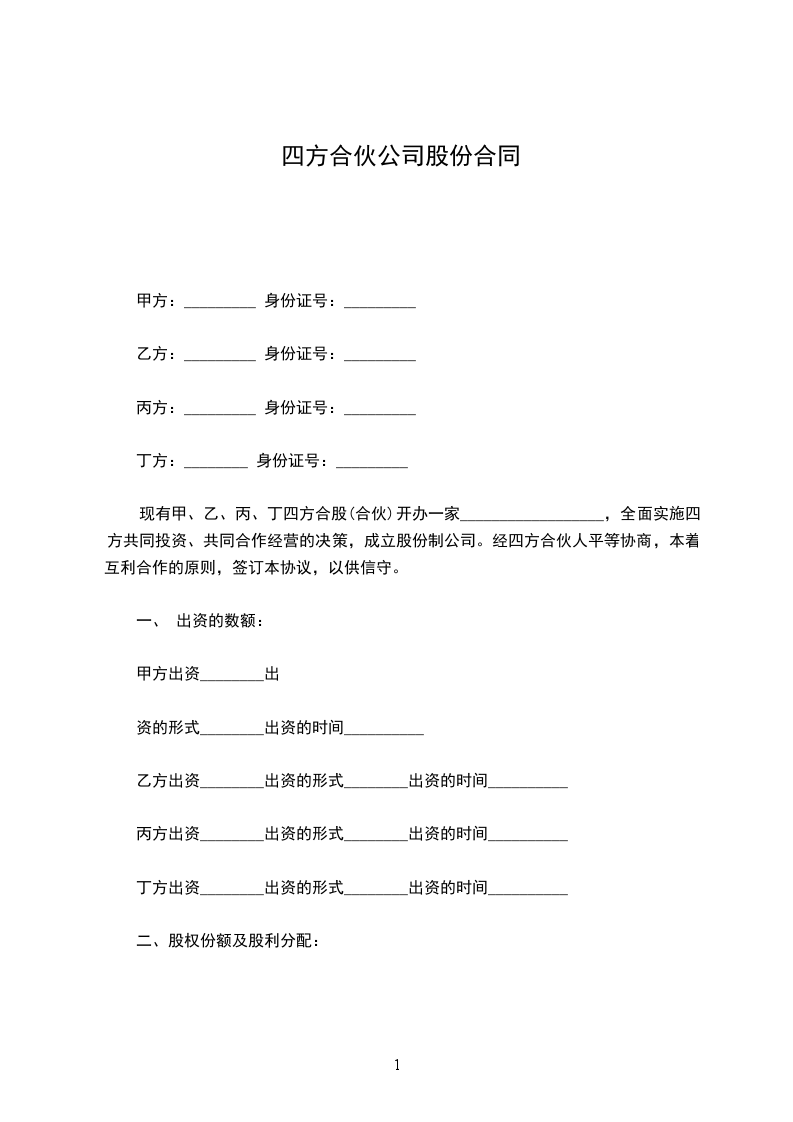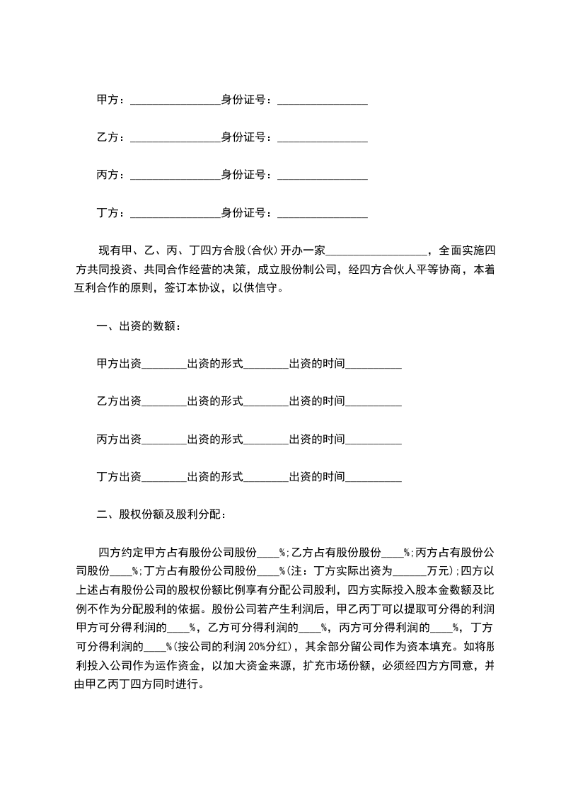 现有甲、乙、丙、丁四方合股(合伙)开办一家__________________,全面实施四方共同投资、共同合作经营的决策,成立股份制公司。经四方合伙人平等协商,本着互利合作的原则,签订本协议,以供信守。