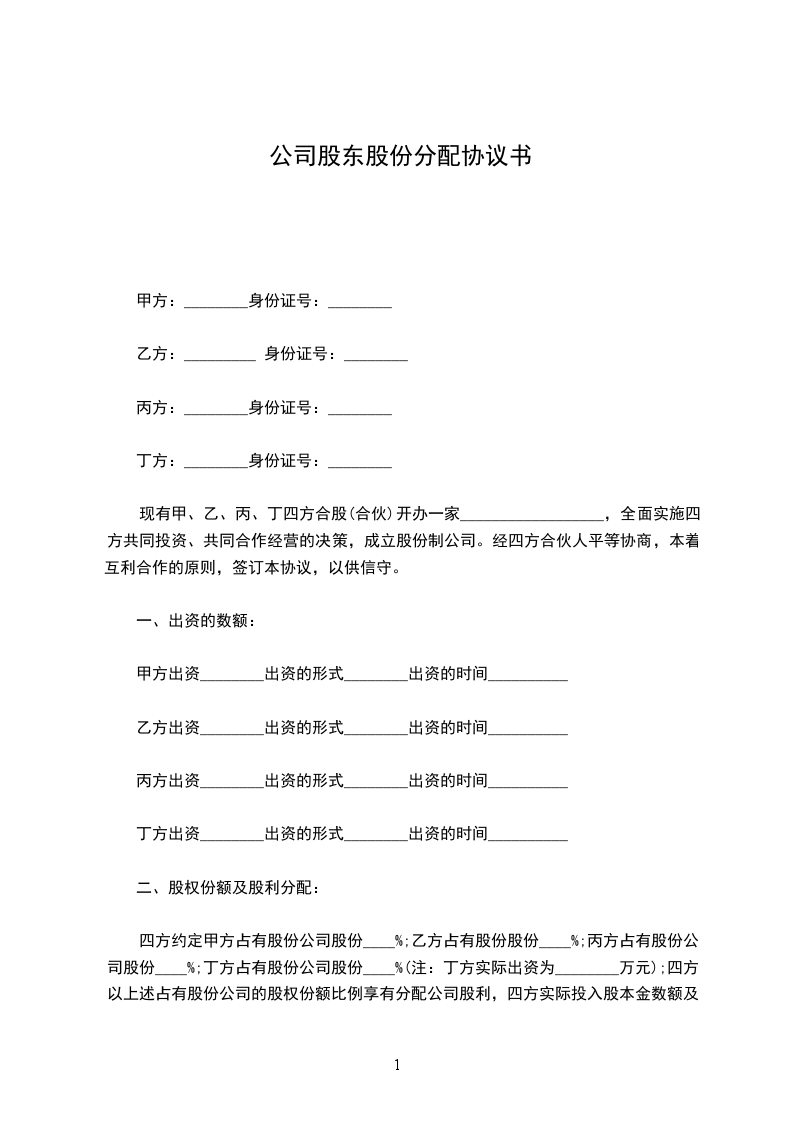 现有甲、乙、丙、丁四方合股(合伙)开办一家__________________,全面实施四方共同投资、共同合作经营的决策,成立股份制公司。经四方合伙人平等协商,本着互利合作的原则,签订本协议,以供信守。