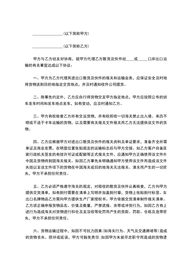 甲方与乙方经友好协商,就甲方代理乙方散货及快件经____或_____口岸出口运输的有关事宜达成以下协议: