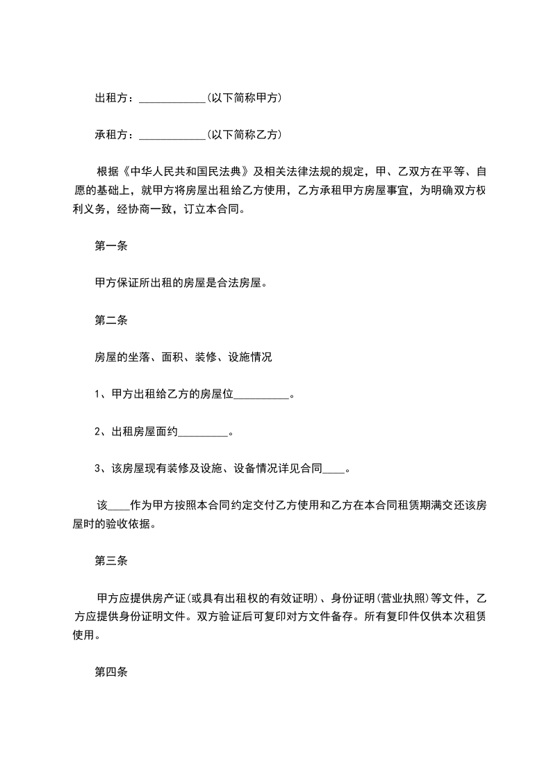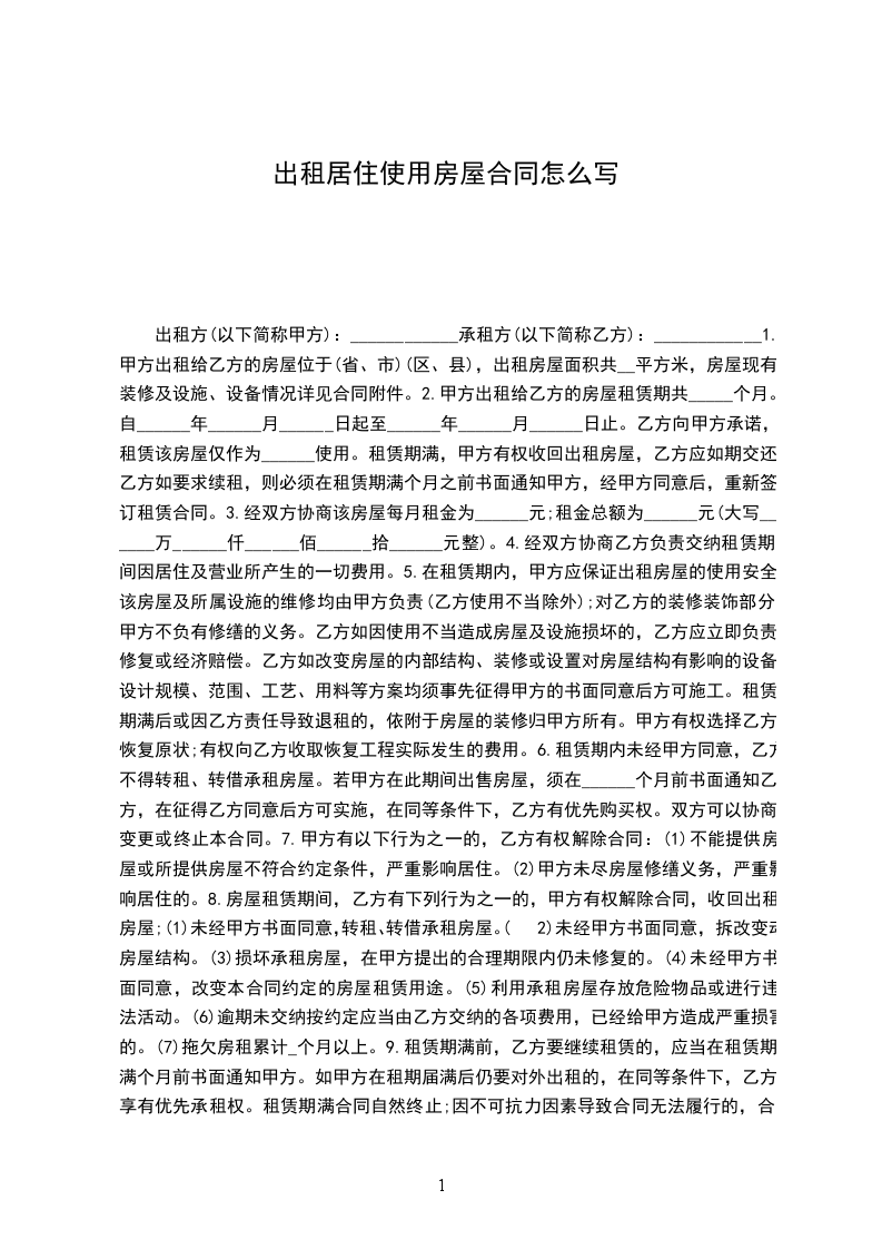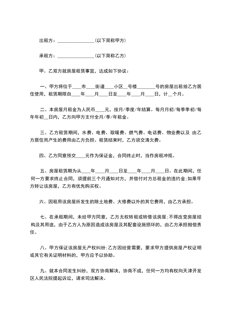 一、甲方将位于________市________街道________小区________号楼________号的房屋出租给乙方居住使用,租赁期限自________年________月________日至________年________月________日,计________个月。