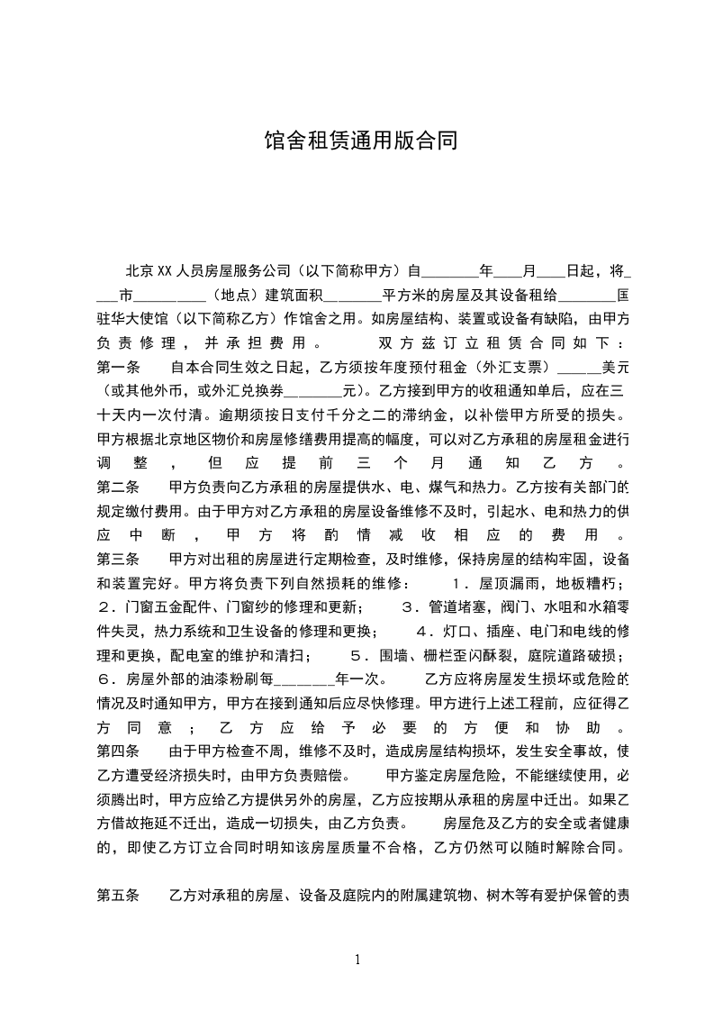 北京XX人员房屋服务公司(以下简称甲方)自____年__月__日起,将____市_____(地点)建筑面积____平方米的房屋及其设备租给____国驻华大使馆(以下简称乙方)作馆舍之用。如房屋结构、装置或设备有缺陷,由甲方负责修理,并承担费用。 双方兹订立租赁合同如下:
