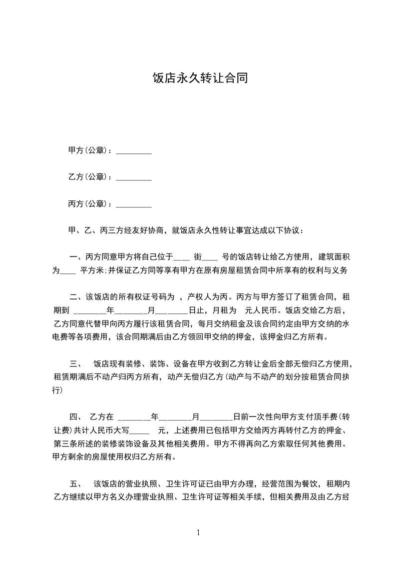 甲、乙、丙三方经友好协商,就饭店永久性转让事宜达成以下协议: