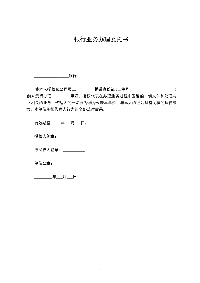 我本人授权我公司员工_________携带身份证(证件号:____________________)前来贵行办理_________事项,授权代表在办理业务过程中签署的一切文件和处理与之相关的业务,代理人的一切行为均为代表本单位,与本人的行为具有同样的法律效力,本单位承担代理人行为的全部法律后果。