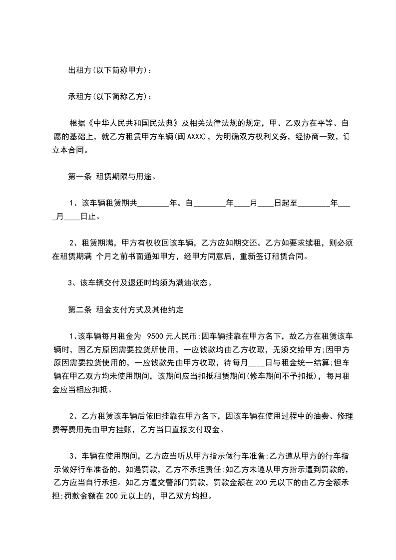 根据《中华人民共和国民法典》及相关法律法规的规定,甲、乙双方在平等、自愿的基础上,就乙方租赁甲方车辆(闽AXXX),为明确双方权利义务,经协商一致,订立本合同。