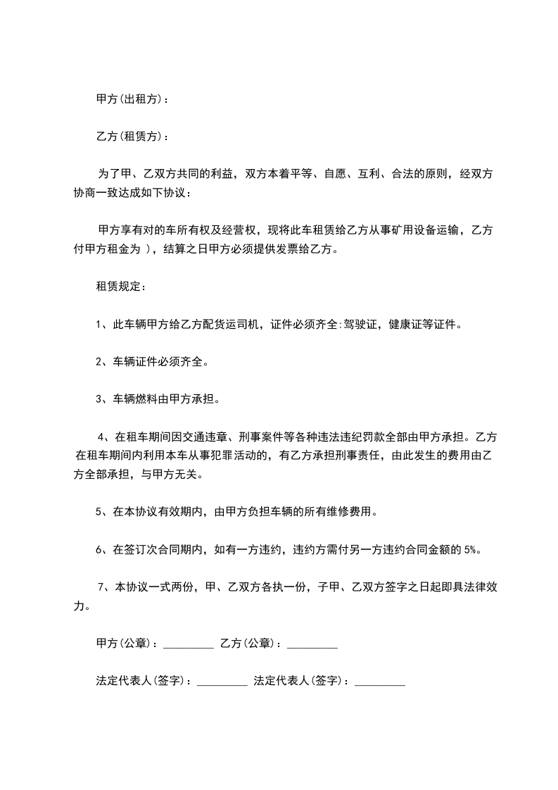 3、出租期间,乙方不得将出租车辆予以转让、转租、抵押、质押、或者以其他方式设定担保。乙方利用租赁车辆运输非法货物所导致的后果均由乙方负责。