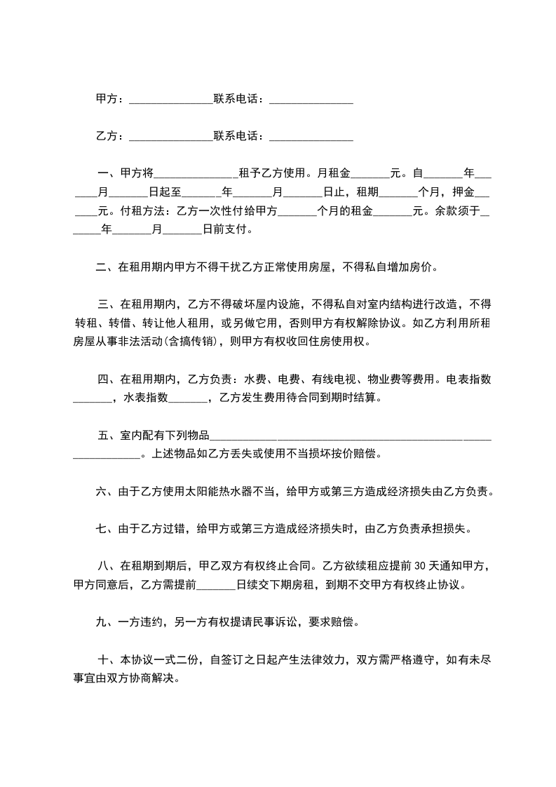 五、室内配有下列物品______________________________________________________________。上述物品如乙方丢失或使用不当损坏按价赔偿。
