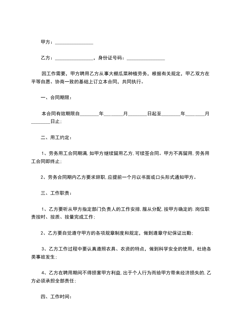 因工作需要,甲方聘用乙方从事大棚瓜菜种植劳务,根据有关规定,甲乙双方在平等自愿、协商一致的基础上订立本合同,共同执行。