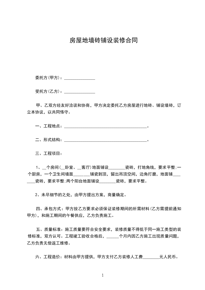 甲、乙双方经友好洽谈和协商,甲方决定委托乙方房屋进行地砖、铺设墙砖,订立本协议,以共同恪守。