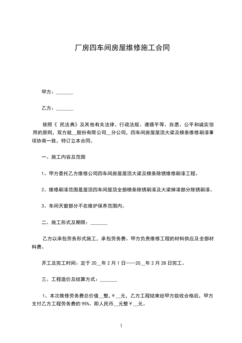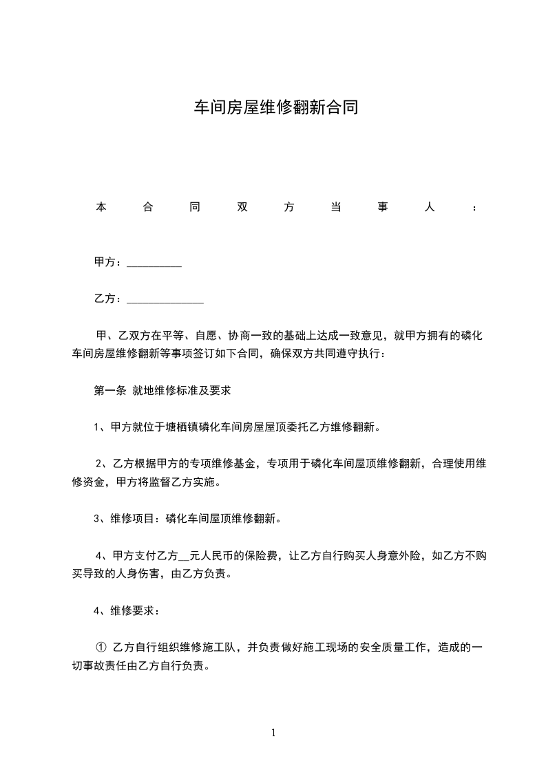 甲、乙双方在平等、自愿、协商一致的基础上达成一致意见,就甲方拥有的磷化车间房屋维修翻新等事项签订如下合同,确保双方共同遵守执行: