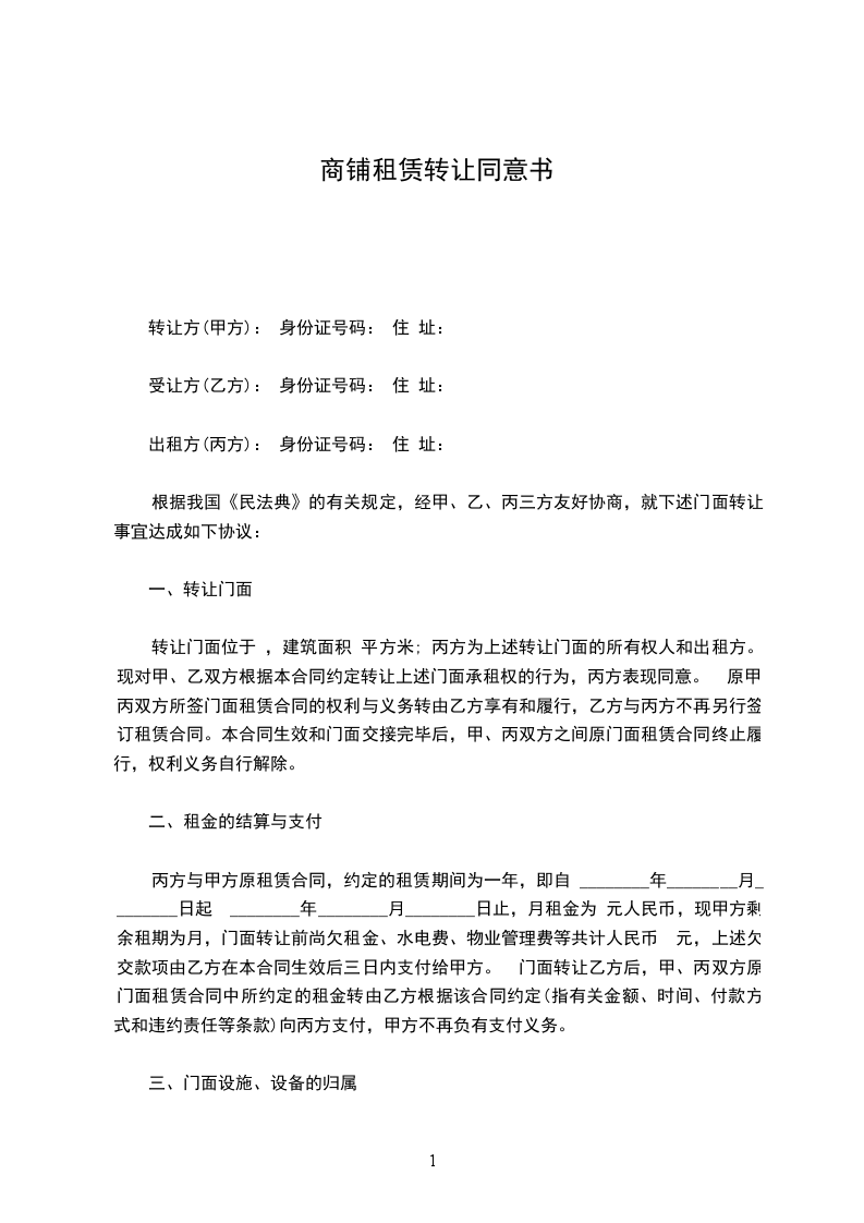 根据我国《民法典》的有关规定,经甲、乙、丙三方友好协商,就下述门面转让事宜达成如下协议: