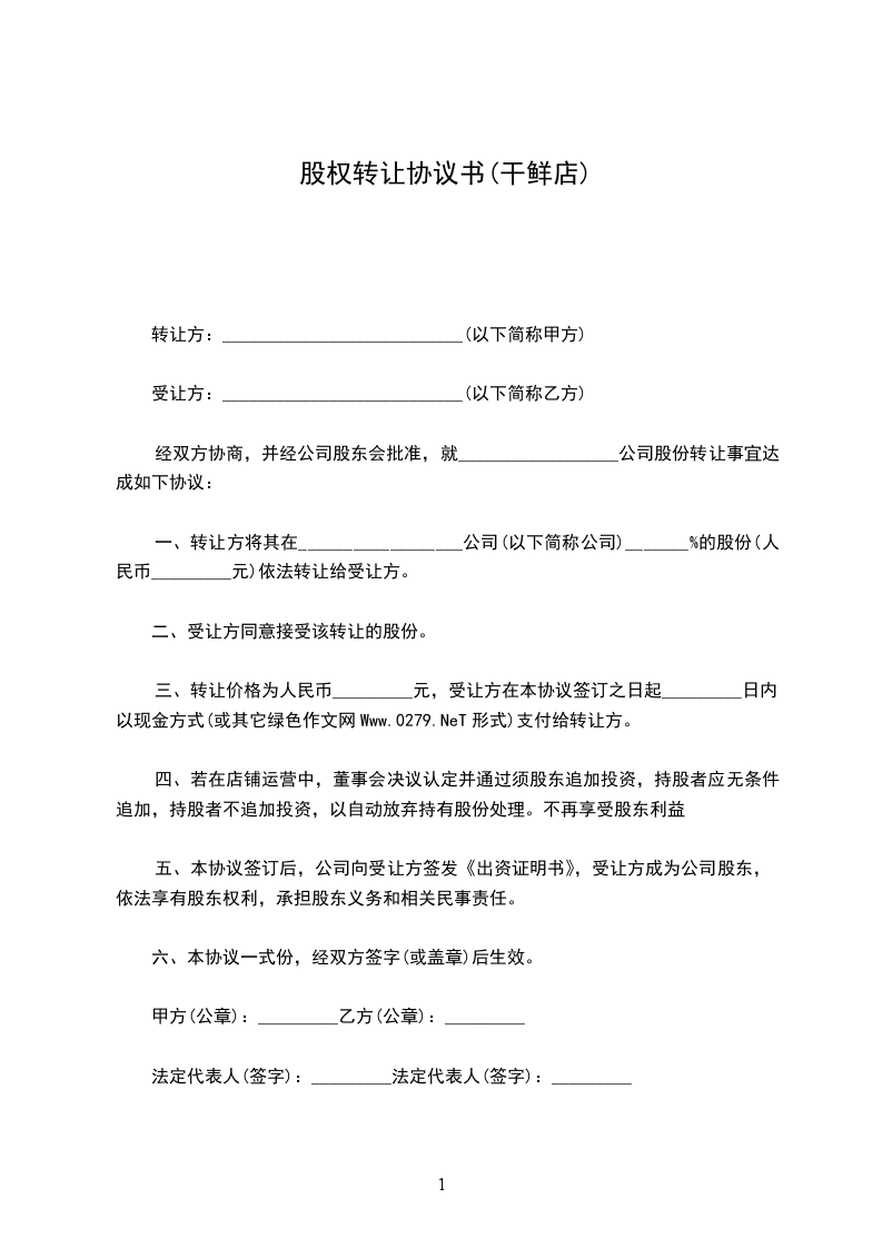 三、转让价格为人民币_________元,受让方在本协议签订之日起_________日内以现金方式(或其它绿色作文网Www.0279.NeT形式)支付给转让方。