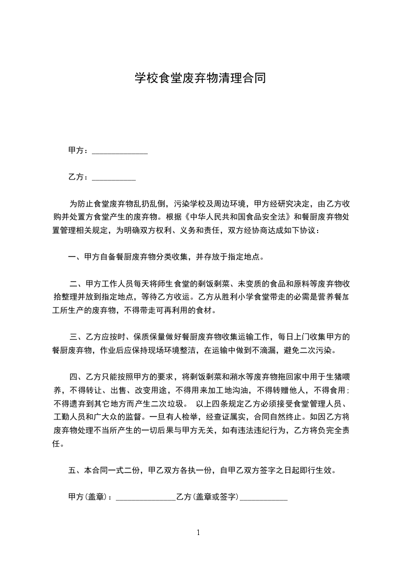 为防止食堂废弃物乱扔乱倒,污染学校及周边环境,甲方经研究决定,由乙方收购并处置方食堂产生的废弃物。根据《中华人民共和国食品安全法》和餐厨废弃物处置管理相关规定,为明确双方权利、义务和责任,双方经协商达成如下协议: