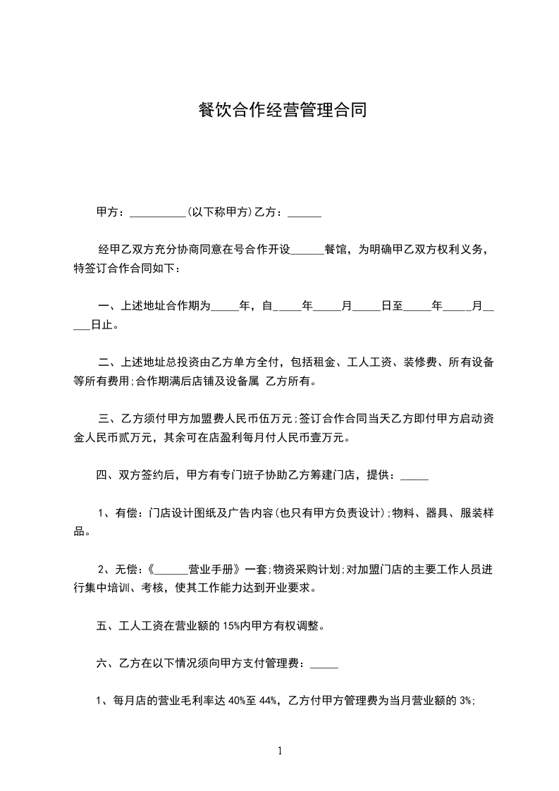 1、每月店的营业毛利率达40%至44%,乙方付甲方管理费为当月营业额的3%;