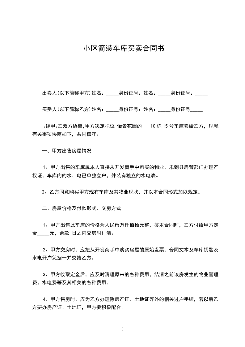 1、甲方出售此车库的价格为人民币万仟佰拾元整,签本合同时,乙方付给甲方定金_____元,余款 日之内交房时付清。