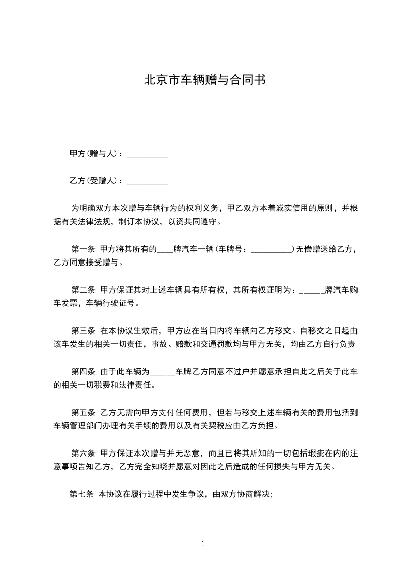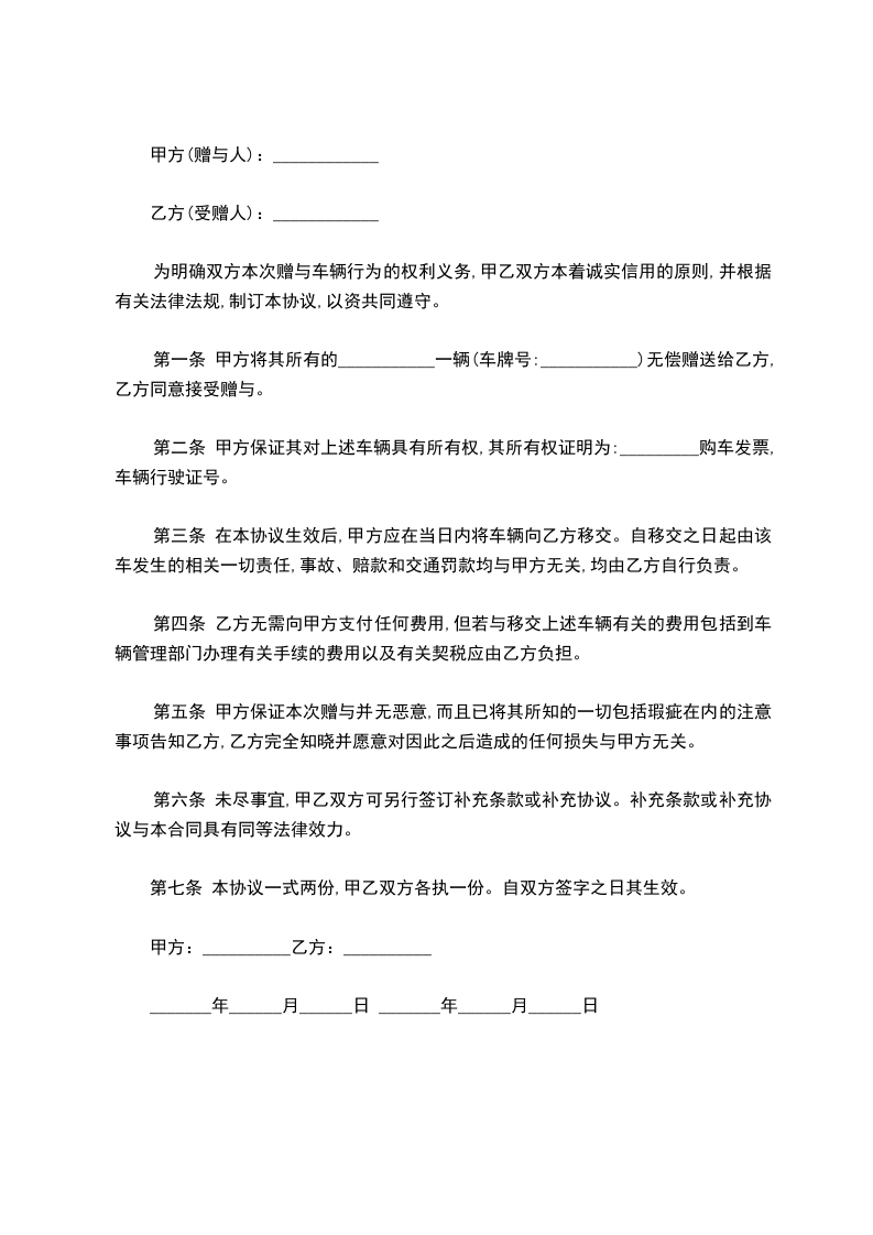 一、甲方将其所有__________赠送给乙方,其所有权证明为:车辆行驶证、车辆合格证、机动车登记证书、车辆购置税完税证明。