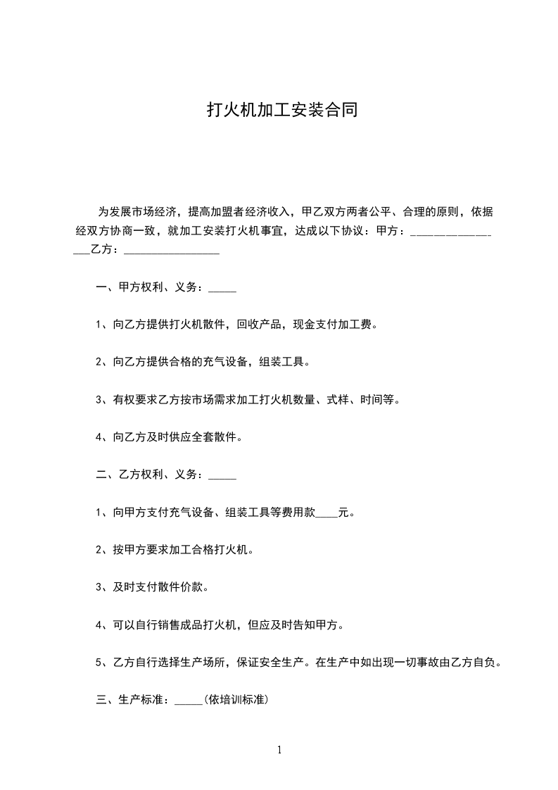 为发展市场经济,提高加盟者经济收入,甲乙双方两者公平、合理的原则,依据 经双方协商一致,就加工安装打火机事宜,达成以下协议: