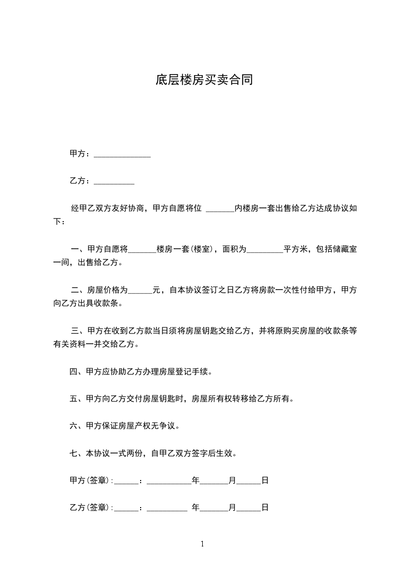 一、甲方自愿将_______楼房一套(楼室),面积为_________平方米,包括储藏室一间,出售给乙方。