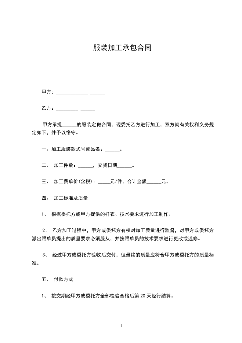 甲方承揽______的服装定做合同,现委托乙方进行加工,双方就有关权利义务规定如下,并予以恪守。