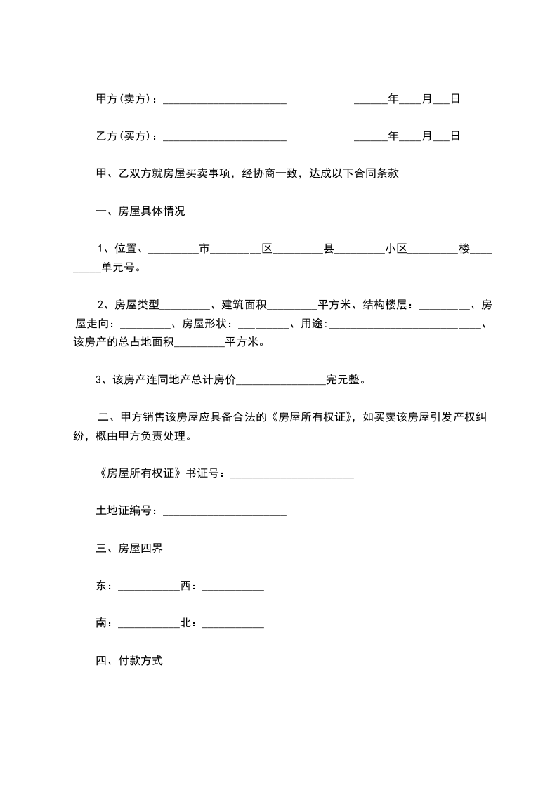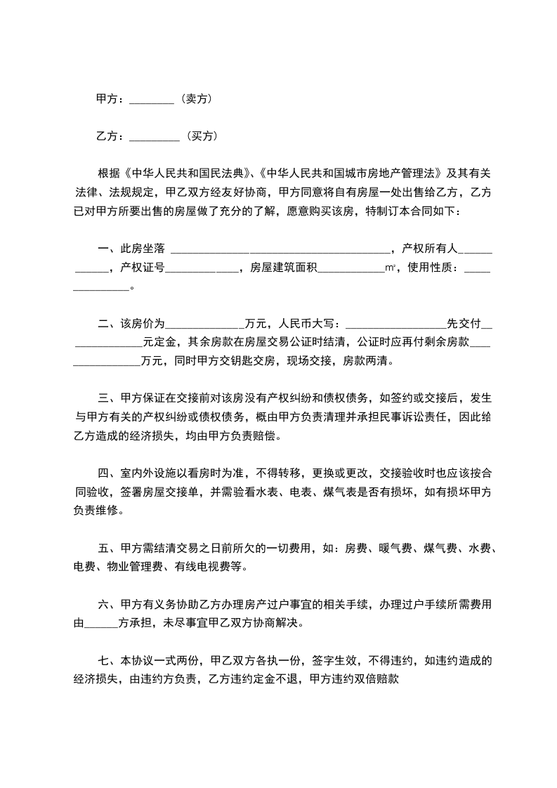 第一条乙方同意购买甲方拥有的座落在______市_____区__________拥有的房产(别墅、写字楼、公寓、住宅、厂房、店面),建筑面积为_____平方米。(详见土地房屋权证第_________号)。