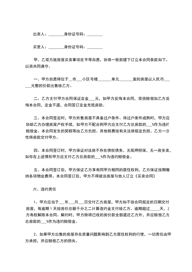第六条违约责任甲、乙双方合同签定后,若乙方中途违约,应书面通知甲方,甲方应在____日内将乙方的已付款不记利息)返还给乙方,但购房定金归甲方所有。若甲方中途违约,应书面通知乙方,并自违约之日起____日内应以乙方所付定金的双倍及已付款返还给乙方。