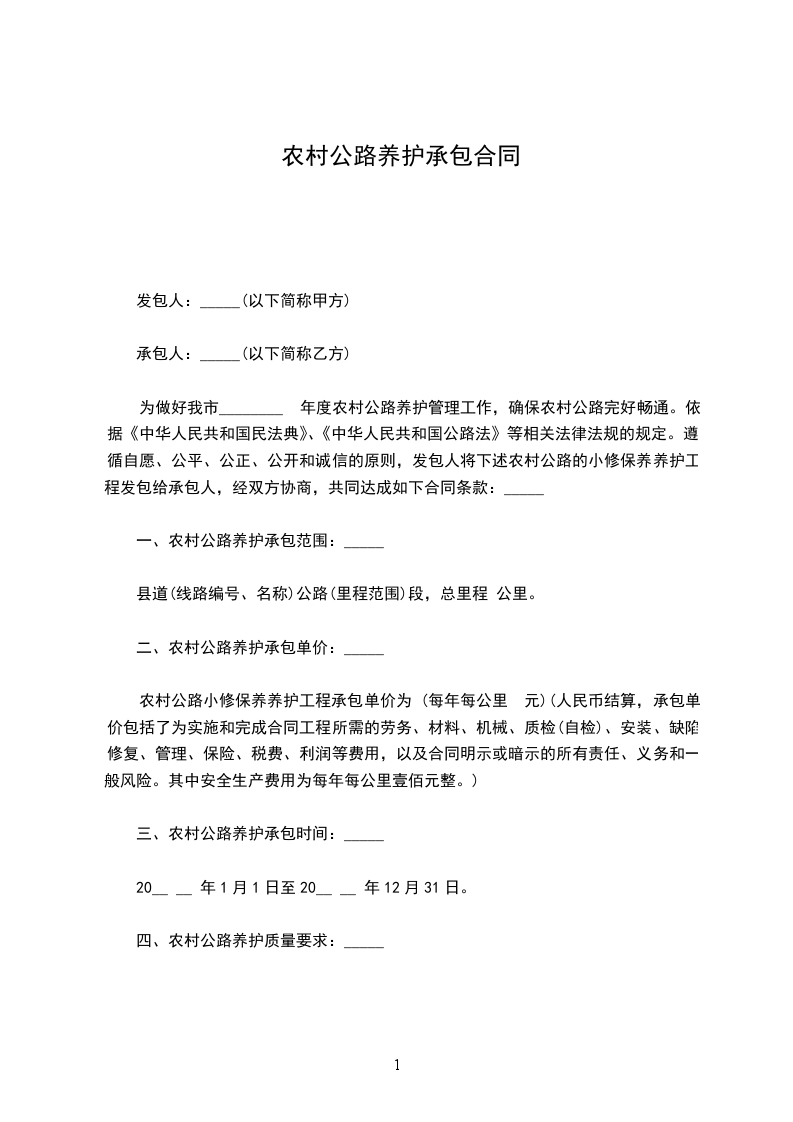 为做好我市________ 年度农村公路养护管理工作,确保农村公路完好畅通。依据《中华人民共和国民法典》、《中华人民共和国公路法》等相关法律法规的规定。遵循自愿、公平、公正、公开和诚信的原则,发包人将下述农村公路的小修保养养护工程发包给承包人,经双方协商,共同达成如下合同条款:_____
