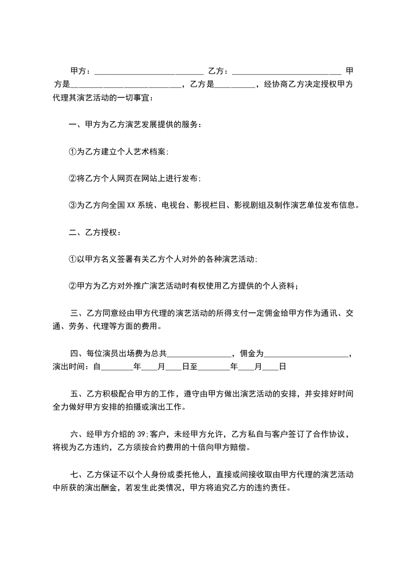 甲方:___________________________ 乙方:___________________________ 甲方是___________________________,乙方是__________,经协商乙方决定授权甲方代理其演艺活动的一切事宜: