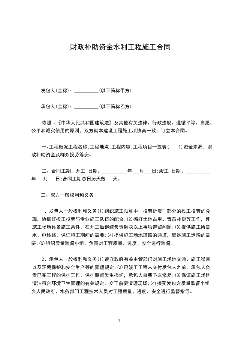 2、承包人一般权利和义务(1)遵守政府有关主管部门对施工场地交通、施工噪音以及环境保护和安全生产等的管理规定;(2)已竣工工程未交付发包人之前,承包人负责已完工程的保护工作,保护期间发生损坏,承包人自费予以修复;(3)保证施工场地清洁符合环境卫生管理的有关规定,交工前要清理现场;(4)接受发包方质量监督小组、乡人民政府、水务部门工程技术人员对工程质量、进度、安全进行监督指导。