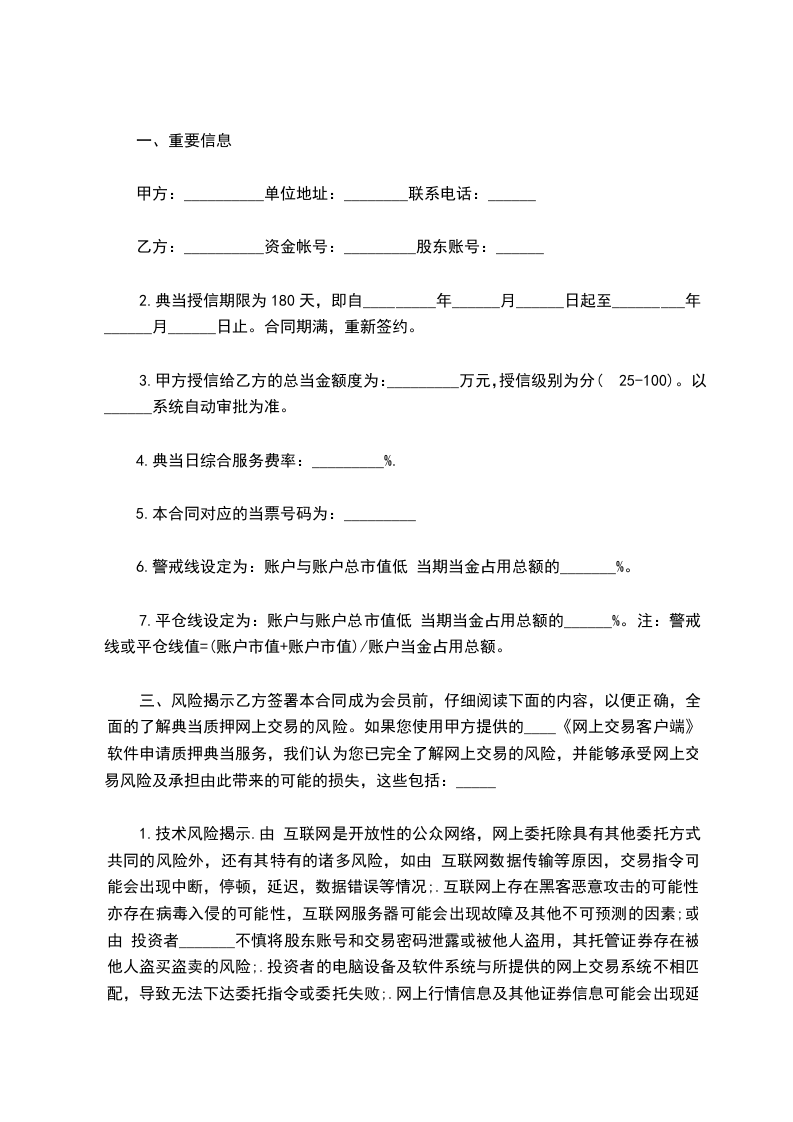 三、风险揭示乙方签署本合同成为会员前,仔细阅读下面的内容,以便正确,全面的了解典当质押网上交易的风险。如果您使用甲方提供的____《网上交易客户端》软件申请质押典当服务,我们认为您已完全了解网上交易的风险,并能够承受网上交易风险及承担由此带来的可能的损失,这些包括:_____