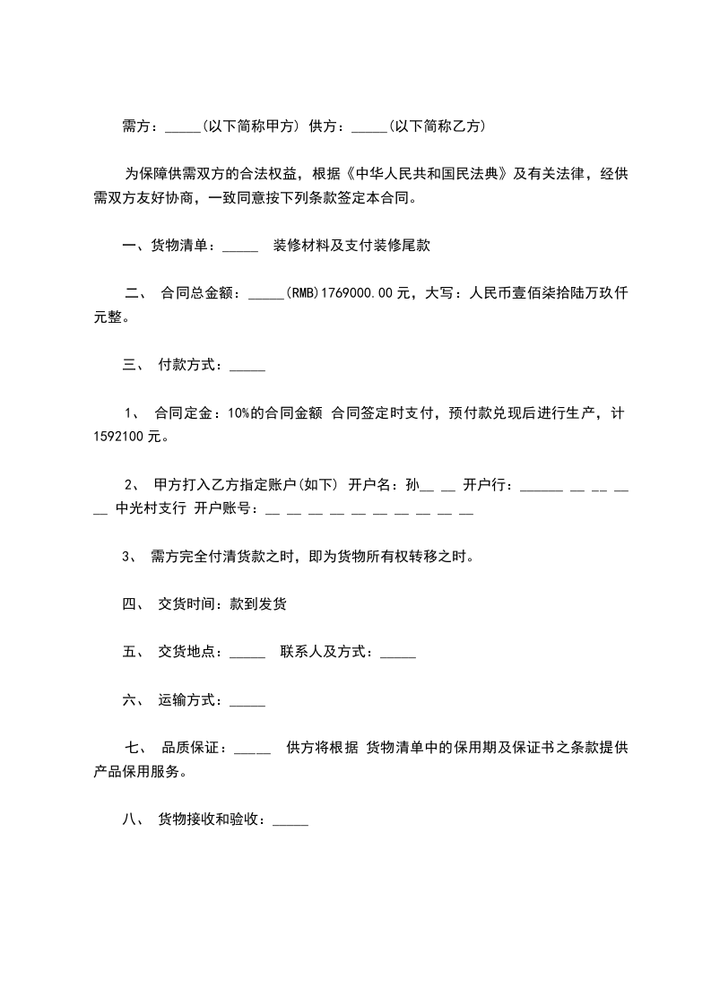 一、货物清单:_____ 装修材料及支付装修尾款