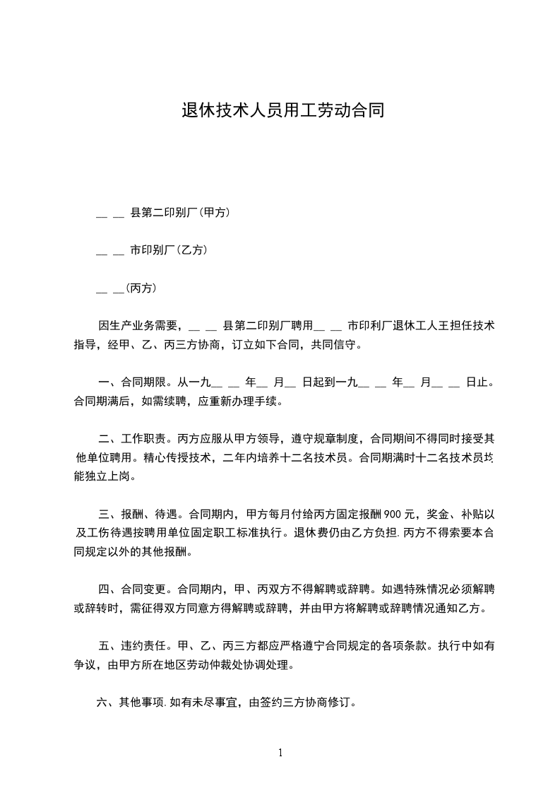 因生产业务需要,__ __ 县第二印别厂聘用__ __ 市印利厂退休工人王担任技术指导,经甲、乙、丙三方协商,订立如下合同,共同信守。