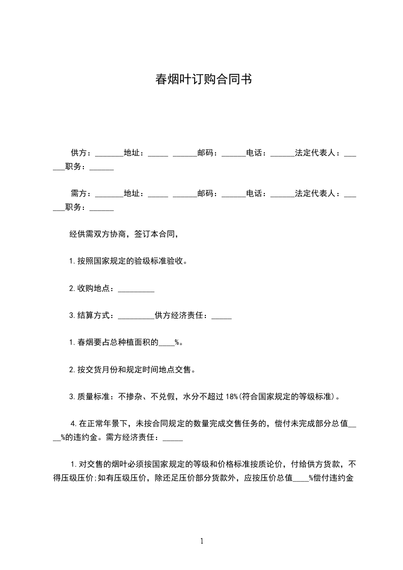 2.在烟叶收购时,约时定点并做到随到随收,不得无故拖延时间,如不按合同规定时间、数量收购,偿付收购不足部分总值____%的违约金。