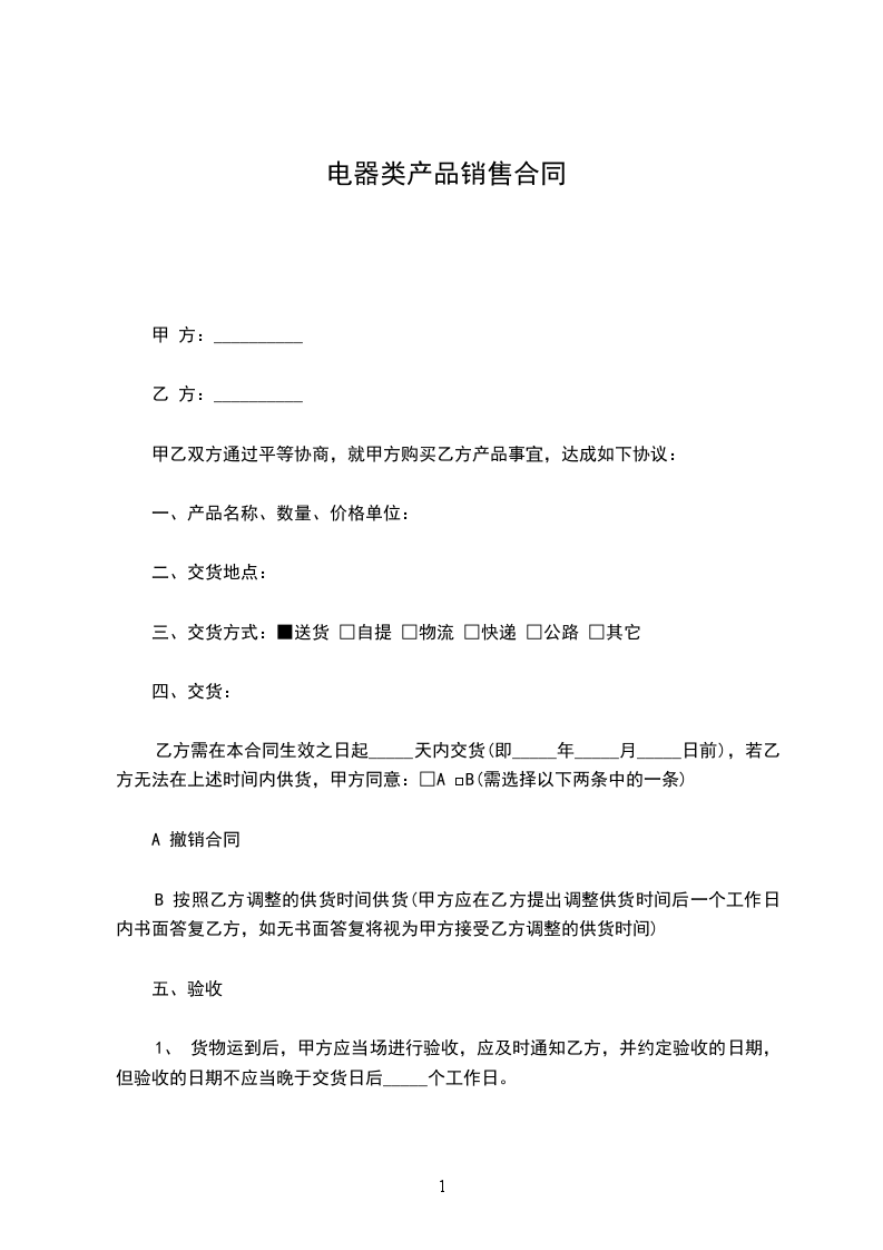 乙方需在本合同生效之日起_____天内交货(即_____年_____月_____日前),若乙方无法在上述时间内供货,甲方同意:□A □B(需选择以下两条中的一条)