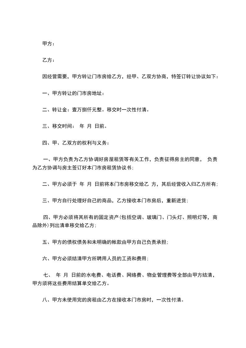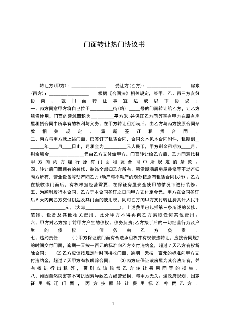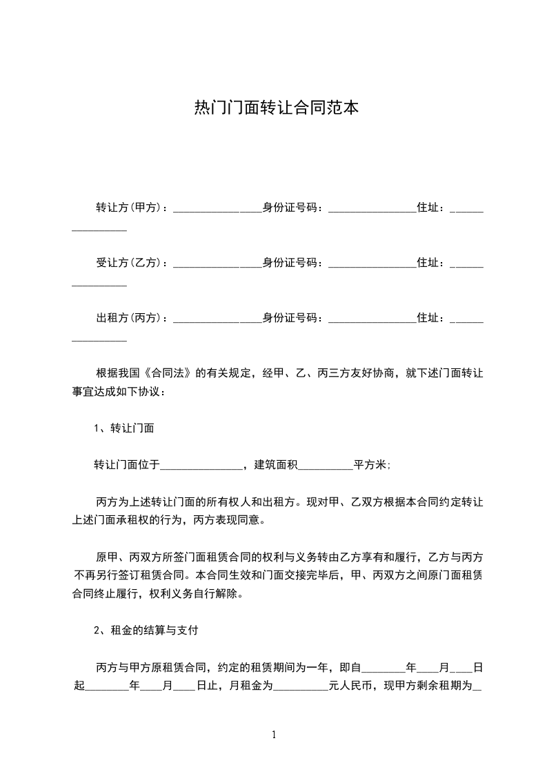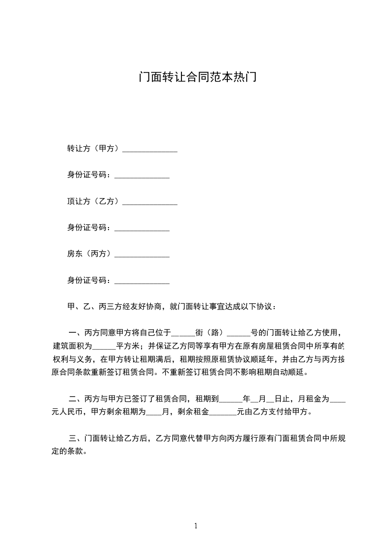 转让方(甲方): 身份证号码: 顶让方(乙方): 身份证号码: 房东(丙方): 身份证号码: 甲、乙、丙三方经友好协商,就店铺转让事宜达成以下协议: