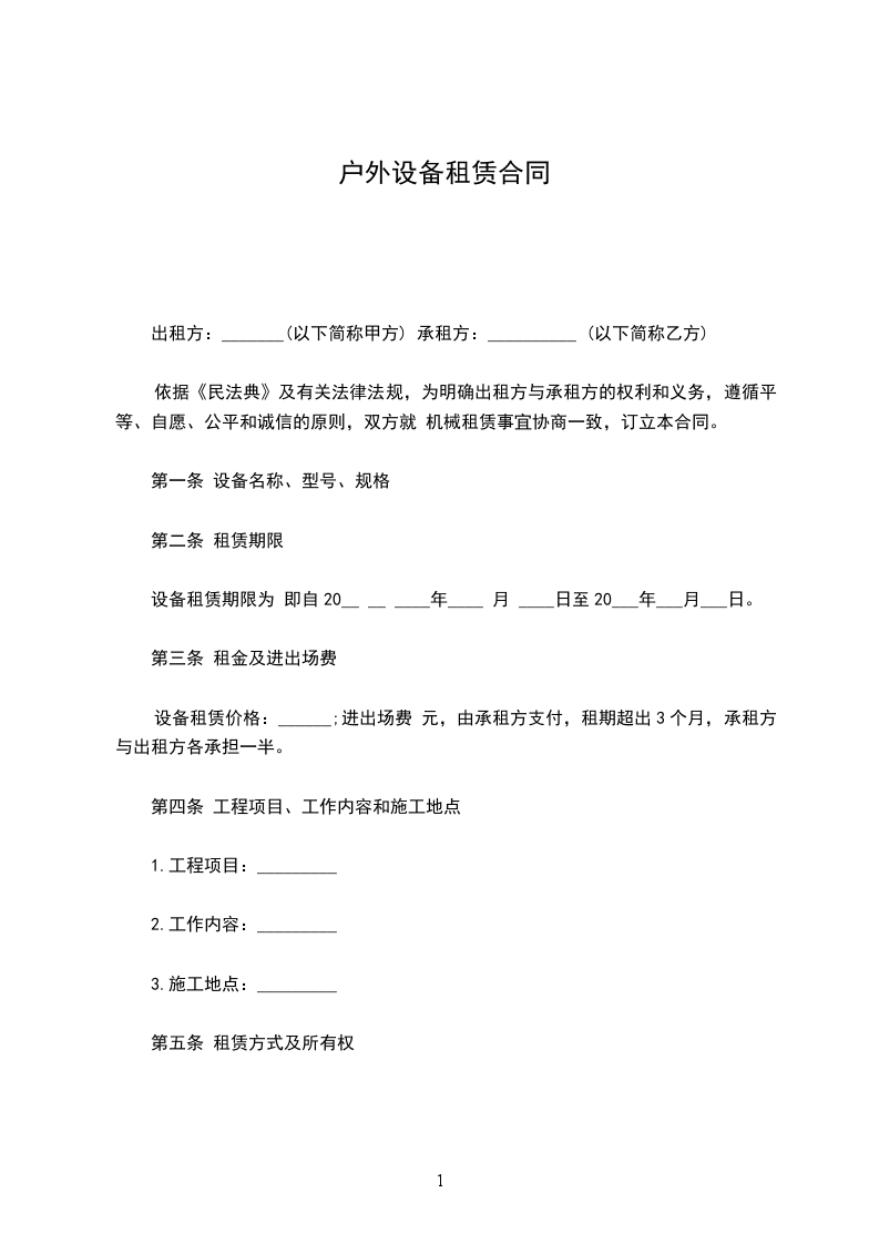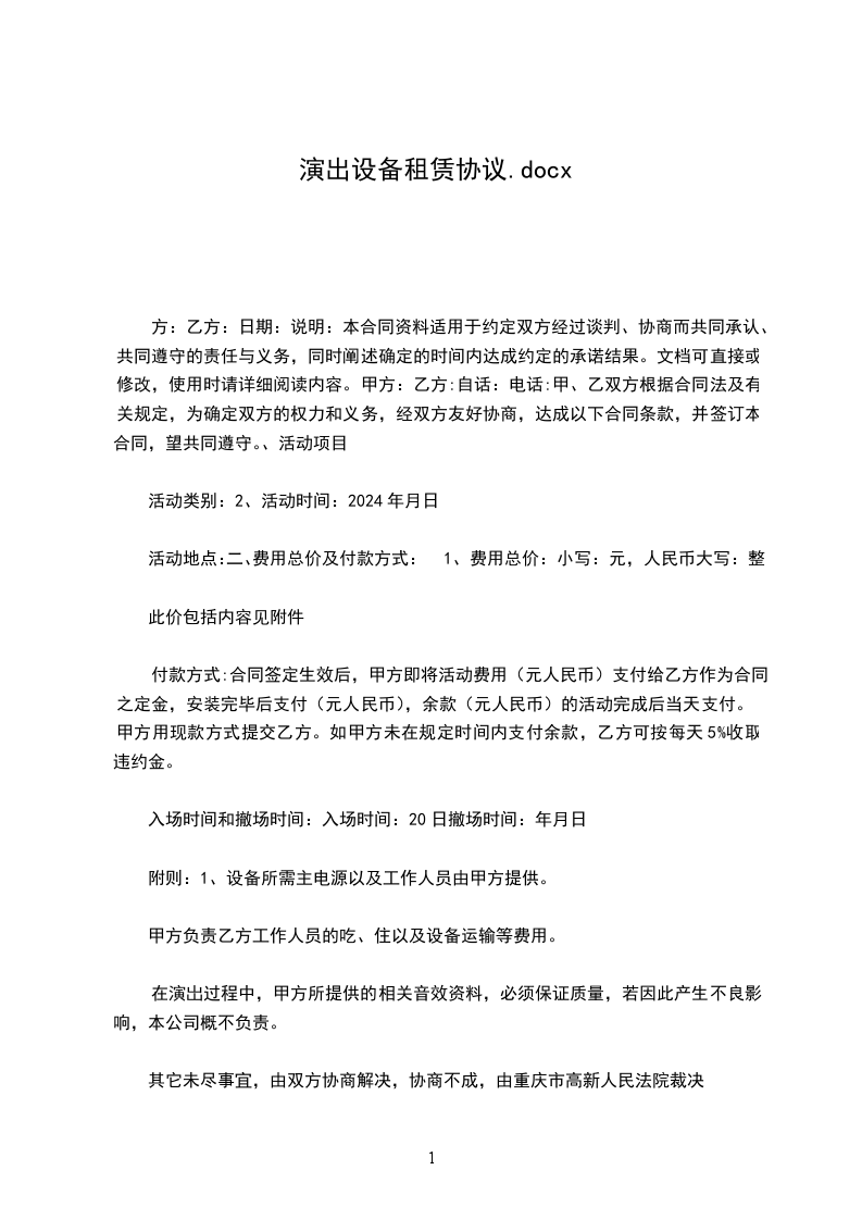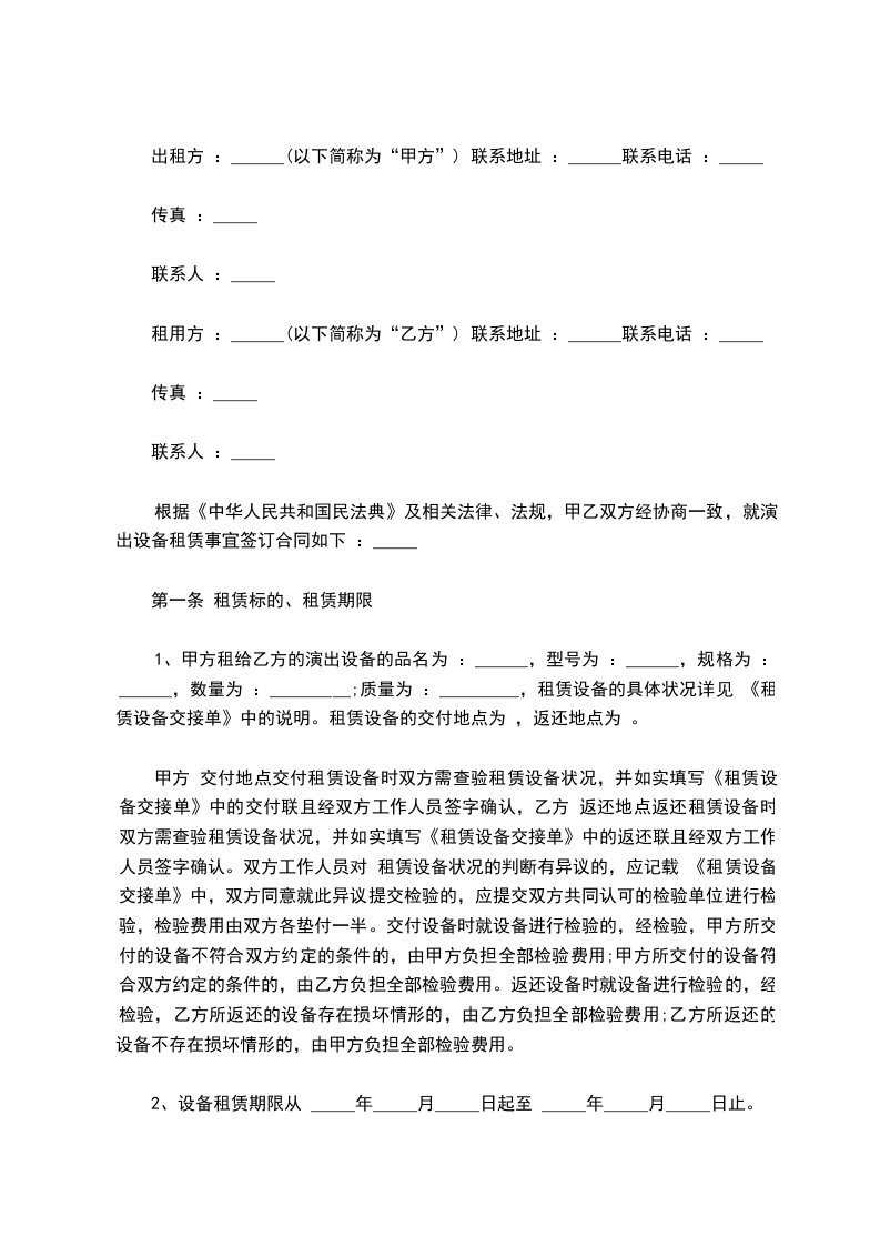 根据《中华人民共和国民法典》及相关法律、法规,甲乙双方经协商一致,就演出设备租赁事宜签订合同如下 :_____