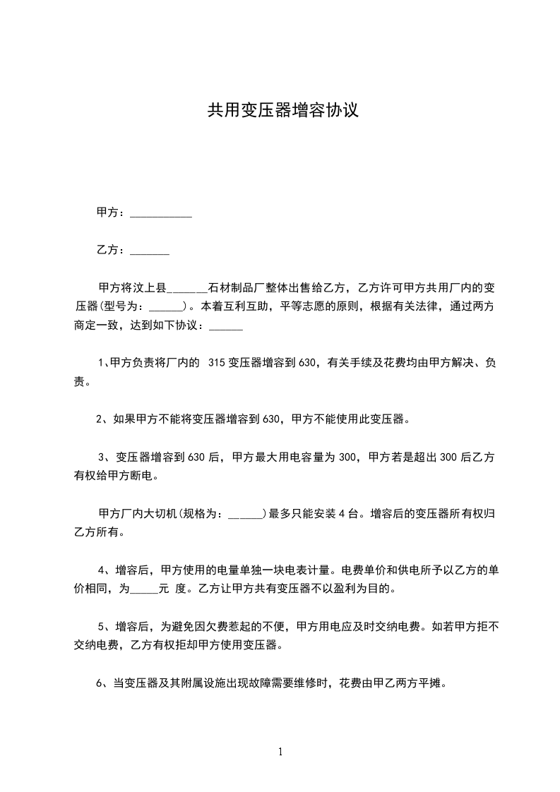 1、甲方负责将厂内的315变压器增容到630,有关手续及花费均由甲方解决、负责。