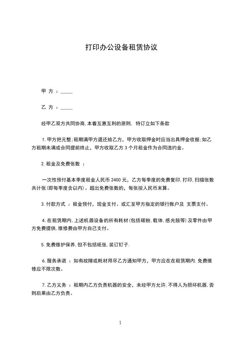 7.乙方义务 :租期内乙方负责机器的安全,未经甲方允许,不得人为损坏机器,否则后果由乙方负责。
