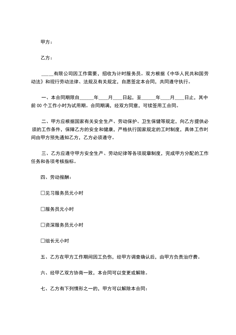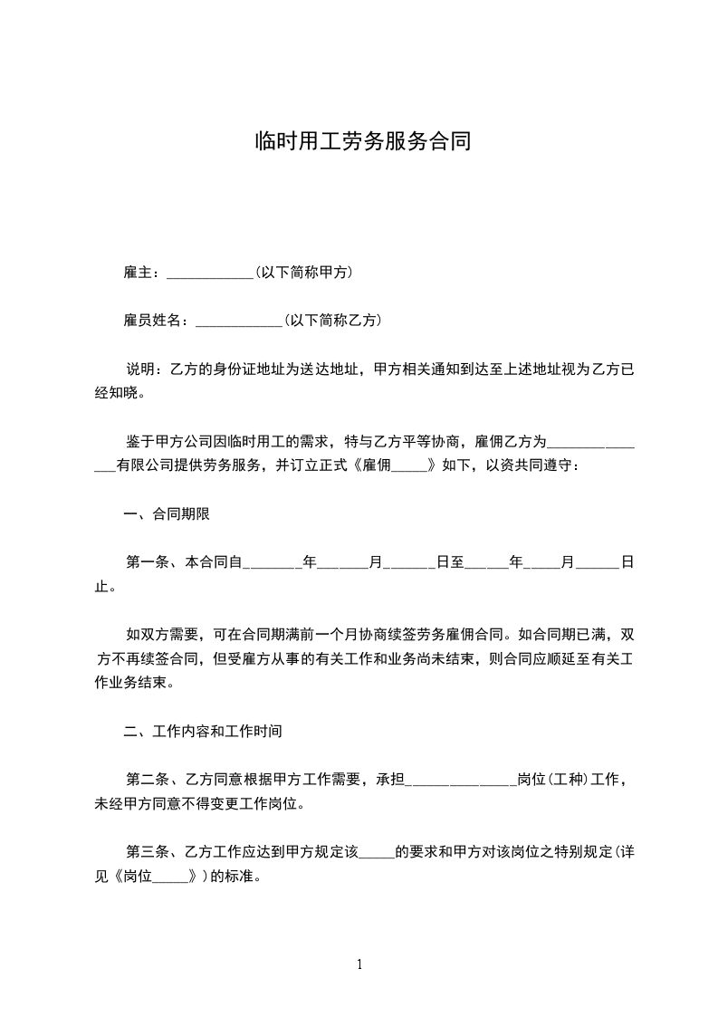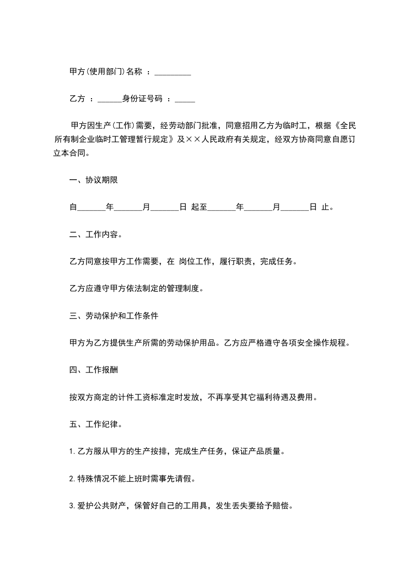 甲方因生产(工作)需要,经劳动部门批准,同意招用乙方为临时工,根据《全民所有制企业临时工管理暂行规定》及××人民政府有关规定,经双方协商同意自愿订立本合同。