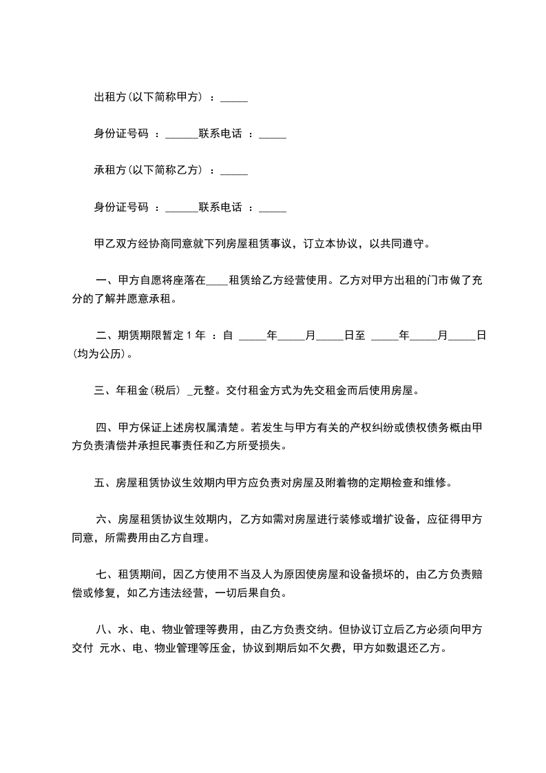 一、甲方自愿将座落在____租赁给乙方经营使用。乙方对甲方出租的门市做了充分的了解并愿意承租。