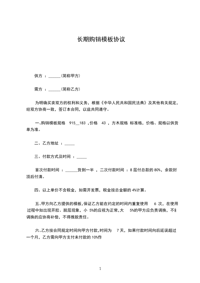 五、甲方向乙方提供的模板,保证乙方能在约定的时间内重复使用 6 次,在使用过程中如出现开胶、脱层现象,小 5%的应视为正常,大 5%的甲方应负责调换,不能调换的应协商补偿,不得推脱责任。