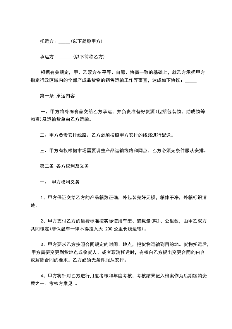 一、甲方将冷冻食品交给乙方承运,并负责准备好货源(包括包装物、助成物等物资)及运输货单由乙方运输。
