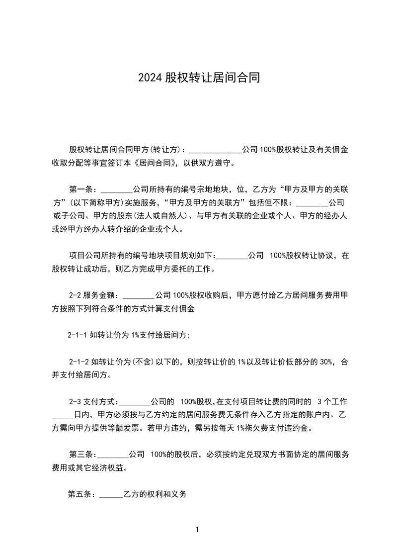 1.甲方委托乙方介绍协作促成甲方与持有100%股权转让,甲方愿支付居间服务费给乙方;