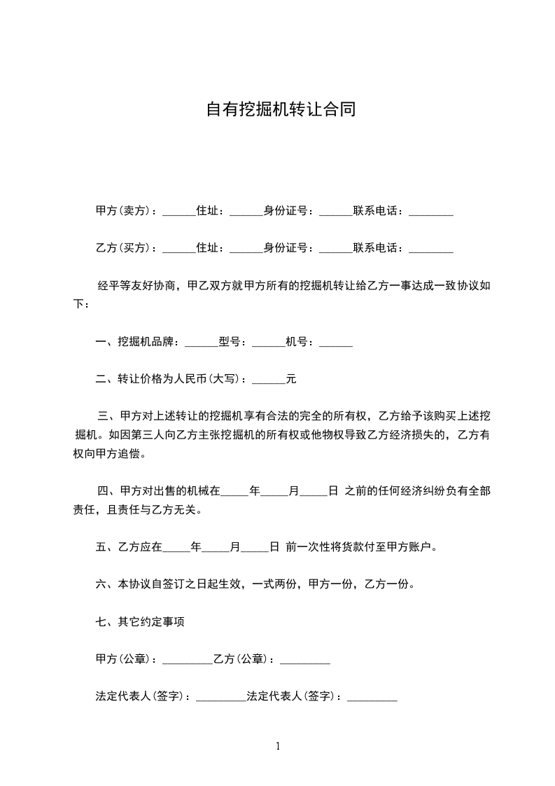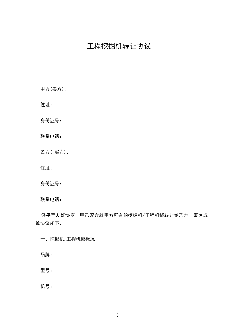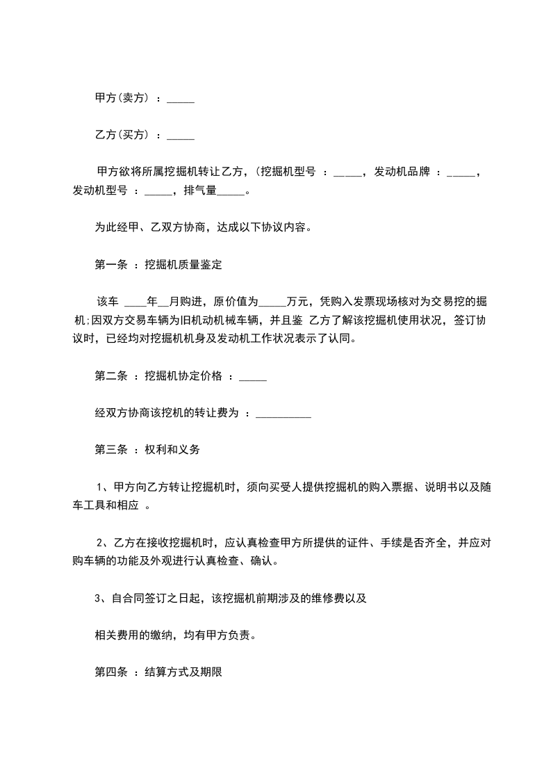 甲方欲将所属挖掘机转让乙方,(挖掘机型号 :_____,发动机品牌 :_____,发动机型号 :_____,排气量_____。