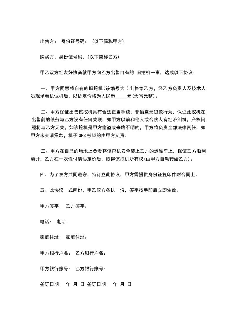 该车 ____年__月购进,原价值为_____万元,凭购入发票现场核对为交易挖的掘机;因双方交易车辆为旧机动机械车辆,并且鉴 乙方了解该挖掘机使用状况,签订协议时,已经均对挖掘机机身及发动机工作状况表示了认同。