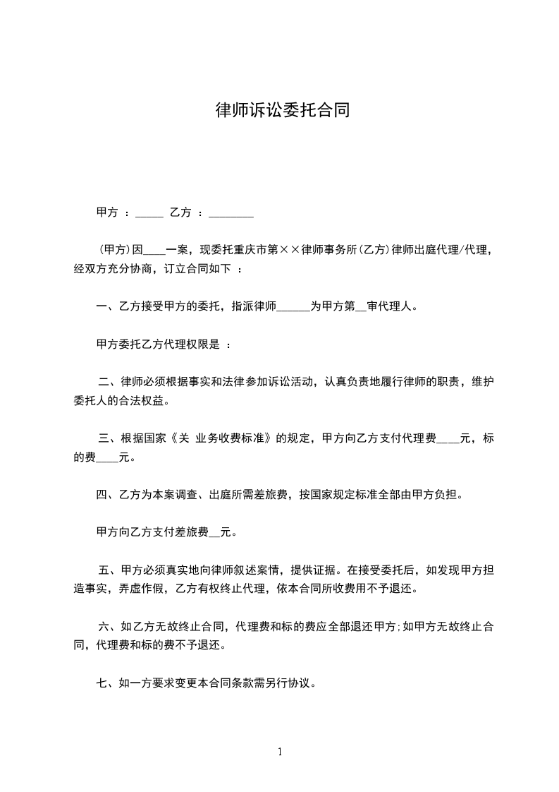 (甲方)因____一案,现委托重庆市第××律师事务所(乙方)律师出庭代理/代理,经双方充分协商,订立合同如下 :