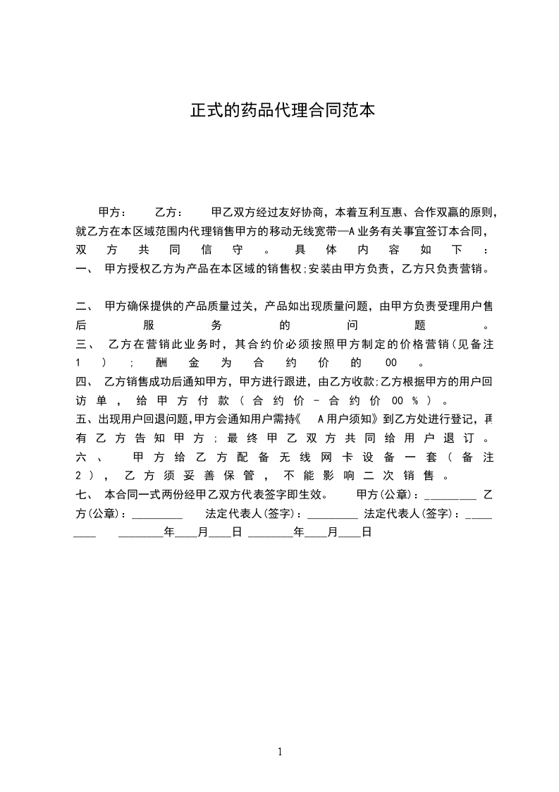 甲方: 乙方: 甲乙双方经过友好协商,本着互利互惠、合作双赢的原则,就乙方在本区域范围内代理销售甲方的移动无线宽带—A业务有关事宜签订本合同,双方共同信守。具体内容如下: